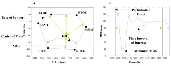 (A): Center of mass (COM) shown within the base of support (BOS). Markers on the feet, RTOE—Right Toe, R5MT—Right Fifth Metatarsal, RH—Right Heel, LT—Left Toe, LM—Left Fifth Metatarsal, LH—Left Heel, form the BOS. The margin of stability (MOS) at each time point is the minimum distance of the COM to the BOS. (B): The trial MOS is the minimum value of the margin of stability across all time points in the trial.