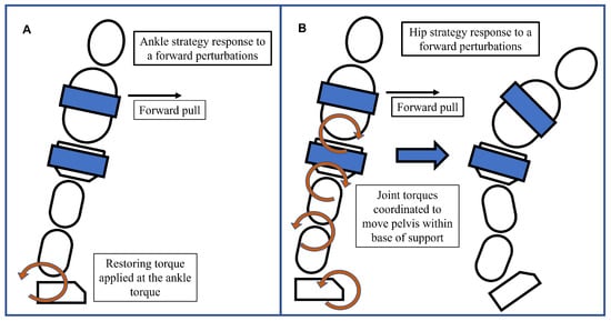 (A) Ankle strategy response to a forward pull. In this response, the upper and lower body rotate in the same direction about the ankles like an inverted pendulum while other joint positions are held rigid. Restoring torques are applied at the feet. (B) Hip strategy response to a forward pull. Restoring torques are generated at the joints, which manipulate body parts and move the center of mass back within the base of support. Hip flexion and foot dorsiflexion create dynamic moments that move the body and attempt to restore balance.
