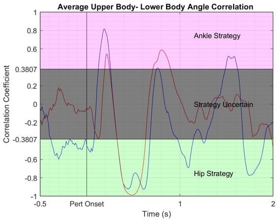 Balance strategy refers to the use of either the ankle or hip strategy in response to a perturbation []. We divided the body into an upper body trunk segment and a lower body segment (thighs, shank, and feet) and examined correlations between the upper body angle in the sagittal plane and the lower body angle. The ankle strategy was identified by positive correlations between the upper body and lower body while the hip strategy was identified by negative correlations between these segments, Figure 5 []. This gives us the following classification for upper-body and lower-body rotations (Table 1).
