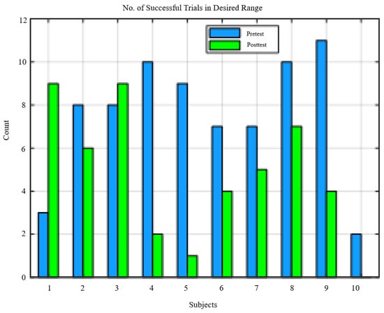 The range of perturbation forces differed between pretest and posttest as seen in the distribution of successful trials, Figure 7 and the change in perturbation force threshold values Figure 8. In order to compare metrics within the same range, perturbation forces above 50% BW and below the lower of the pretest force the posttest force thresholds were selected. Figure 7 shows the number of valid trials for each subject used to calculate the results.