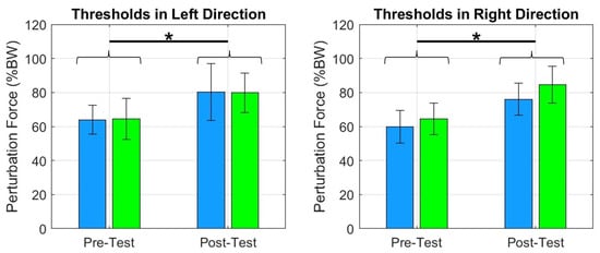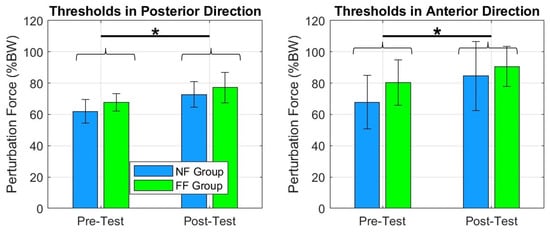 The plots show an increase in force thresholds between pre- and posttests for FF and NF groups across the four directions. We can notice that both groups improved their tolerance to receive greater perturbation intensities. * = .