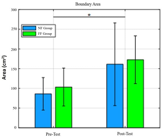 Stability area for pretest and posttest values in NF and FF groups. We can observe that RobUST, in combination with VR, was enough to increase the area of postural stability in standing. * = .