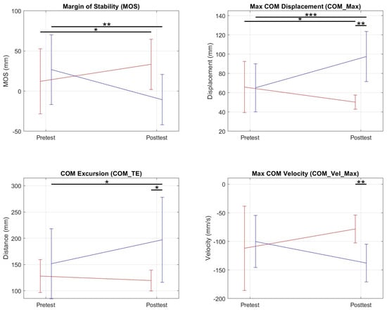 Graphs of pretest and posttest averages of NF (red) and FF (blue) groups for metrics in which a significant interaction effect was present. For the margin of stability, we found a significant increase between the pretest and posttest for the NF group and a decrease for the FF group. * = 0.05; ** = ; *** = ≤ 0.001.