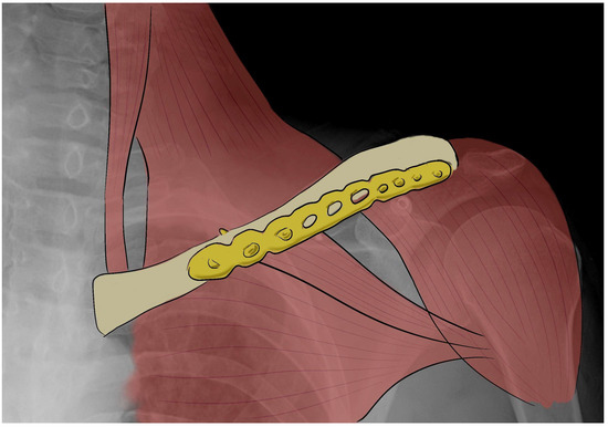 Fractures of the middle portion of the clavicle are most treated surgically by open internal reduction with a superior or anteroinferior plate and screws or by intramedullary nailing (Figure 2) [32,33,34,35].