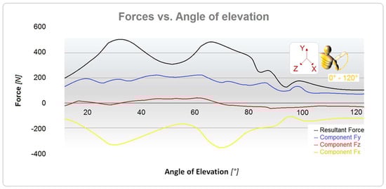 In order to assess the forces applied to the shoulder joint, a three-dimensional joint model was created and loaded using data derived from a clinically validated shoulder implant (BIOMODULAR, Biomet Germany, Berlin, Germany, with six strain gauges and nine-channel telemetry). Peak resultant forces (Fp) were determined using MATLAB software (ver. R2023b), as shown in Figure 3, which shows the angle of elevation (°) vs. force (N) curves. In Figure 4, the schematic loading conditions to perform numerical analysis are represented.