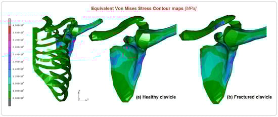 The aim of the present research was to estimate stress distribution occurring in a clavicle fracture surgically treated with a plate, compared to a healthy one, during elevation of the shoulder. Numerous previous studies have used FE analysis to gain a better understanding of the disease consequences in terms of timing, outcomes, and healthcare costs [35,42,43,44]. Several authors have demonstrated improved early functional outcomes with lower rates of nonunion and symptomatic aesthetic deformity with surgical treatment of clavicle fractures compared to non-surgical treatment [45,46]. The decision between surgical and non-surgical treatment should be based on several factors, such as the severity of the injury, the occurrence of complications, the patient’s age, and the activity level [14]. Indeed, no solid evidence exists that the long-term functional outcome of surgery is significantly superior to non-surgical treatment [21]. After a bone fracture, if surgery is required, the choice of device depends on the fracture characteristics and on the surgeon’s preference [18,47], but functional needs are one of the most important points in the choice of treatment [48,49]. Clinical implications for the choice of fixation type include consideration of the potential stress distribution and fixation failure associated with different plate designs in clavicle fracture fixation [50]. This stress concentration is due to factors such as plate fracture or deformation, excessive stress concentration, and the position of the plate and screws used to fix the fracture [51,52]. When intramedullary fixation is compared with plate and screw fixation, the latter offers a greater biomechanical advantage in terms of stiffness and bending strength [18,50]. The advantages of intramedullary fixation of clavicle fractures include a smaller incision, less soft tissue disruption, less bone prominence, and avoidance of supraclavicular sensory nerves [53].