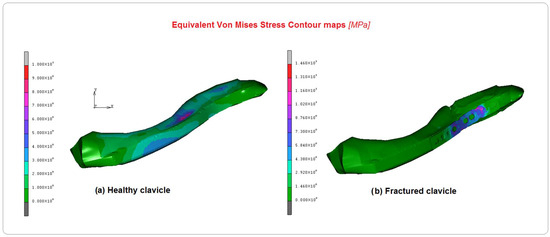 Equivalent von Mises contour maps on the FE model and comparison between (a) healthy clavicle and (b) implanted clavicle.