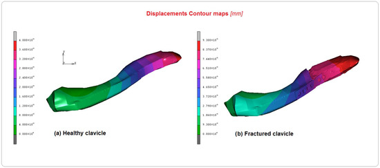 Comparison of displacement contour maps between (a) healthy clavicle and (b) implanted clavicle.