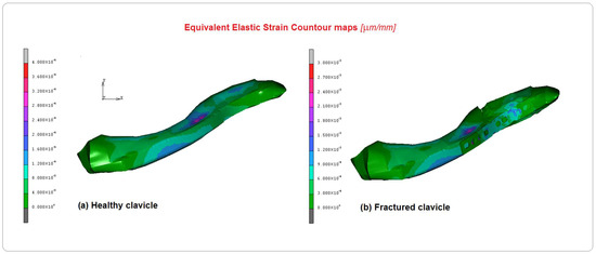 Comparison of the equivalent elastic strain contour maps between (a)the healthy clavicle and (b) the implanted clavicle.