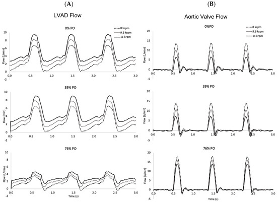 Time series of flow through the LVAD and aortic valve for PO levels of 0%, 39%, and 76% at three LVAD speeds (8, 9.6, and 11 krpm). The native cardiac contraction level corresponds to an unsupported ejection fraction of 21%. (A). Higher LVAD speeds result in higher flow rates, but pump obstruction reduces it. (B). More flow is ejected through the aortic valve at low LVAD speeds and it increases with the pump obstruction level.
