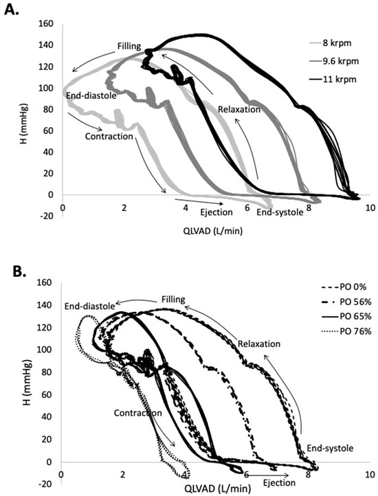 The pressure difference across the LVAD, H, as a function of LVAD flow rate, illustrates the cyclic flow through the LVAD. (A). At end diastole, LVAD flow is at a minimum and it increases during the contraction and ejection phases. As LVAD flow increases, the H-Q loop shifts up and to the right. (B). As PO is increased from 0% to 76% of the inflow area at a LVAD speed of 9.6 krpm, the H-Q loop shifts leftward and the range of Q decreases dramatically.