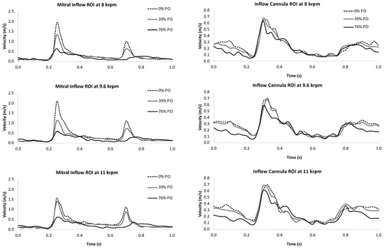 The velocity field measured in the LV midplane in Figure 4 illustrates the vortex ring mitral inflow, diastolic swirling, and systolic outflow as PO increases (See Supplementary Materials S1–S4 for movies). While the main vortex structure of the pattern is maintained, there is a reduction in the strength of the mitral inflow during early diastole (E-wave) and atrial contraction (A-wave), which is confirmed by the results shown in Figure 5. Systolic ejection through the LVAD is reduced with PO, while outflow through the aortic valve increases. As shown in Figure 5, LVAD flow is reduced not only during systole but also in diastole.