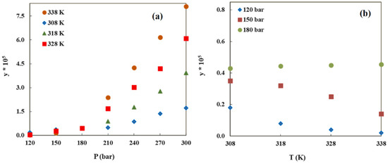 The utilization of SCF technology represents one of the most effective approaches for reducing side effects and enhancing bioavailability by reducing the particle size of drugs to the micro or nanoscale. The solubility of drugs in SCCO2 constitutes a crucial factor for the successful preparation of particles, particularly those of small dimensions. Similar to the presence of crossover points, it should be noted that temperature and pressure do not necessarily exert singular and stable influences on solubility. As illustrated in Figure 1, pressure exhibits a unidirectional effect on the solubility of drugs in SCCO2, with higher pressures resulting in increased solubility (Figure 1a). Conversely, the impact of temperature on solubility is intricate due to the existence of a “crossover pressure” at specific pressure values. When operating conditions align with this particular pressure, solubility remains relatively constant irrespective of temperature variations (Figure 1b). When the pressure is below the crossover pressure, the reduction in density predominantly governs the solubility of drugs in SCCO2, with solubility decreasing as the temperature rises. Conversely, when the pressure exceeds the crossover pressure, the sublimation pressure takes precedence in influencing solubility, resulting in an increase in solubility with increasing temperature [23]. In experiments conducted by Alshahrani et al., the solubility of metoprolol in SCCO2 was measured to be approximately 0.45 × 10−5 mol·mol−1 at a crossover pressure of 180 bar [24]. The solubility of tamoxifen, a cancer-fighting medication, in SCCO2 was measured to be approximately 1.0 × 10−4 mol·mol−1 under the conditions of a crossover pressure of 200 bar by Pishnamazi and colleagues [25]. Hence, to investigate the influence of operational parameters on the solubility of drugs in SCCO2, it is necessary to separately explore the impacts of temperature, pressure, and density as well as the combined effects of temperature, pressure, and density. Experimental determination of supercritical solubility under various operating conditions is a time-consuming, expensive, and challenging endeavor. Moreover, relying solely on experimental measurements of drug solubility yields discrete data points, making it difficult to discern the continuous variation trends in solubility across different operating conditions. Therefore, empirical models that do not involve physical fundamentals or critical properties are typically considered the preferred approach to correlate the solubility of different substances in SCCO2 under varying conditions.