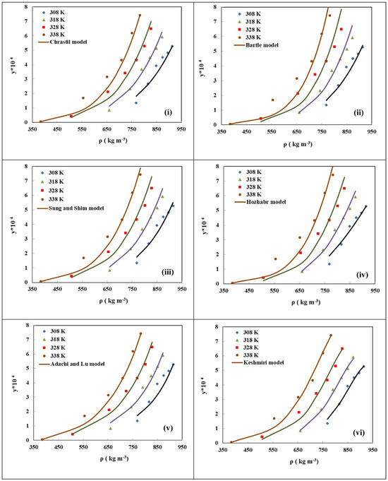 Comparison of experimental Febuxostat solubility, y(mol·mol−1), in SCCO2 (points) and calculated ones (line): (i) Chrastil, AARD% = 15.738, (ii) Bartle, AARD% = 17.540, (iii) Sung and Shim, AARD% = 15.506, (iv) Hozhabr, AARD% = 16.314, (v) Adachi and Lu, AARD% = 13.304 and (vi) Keshmiri, AARD% = 10.630, models at different conditions. Copied with permission [28]. Copyright 2022, Elsevier B.V.