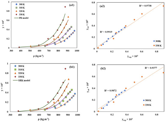 Comparison of experimental (points) and calculated (line) solubility of Chloroquine, y(mol·mol−1), in SCCO2, (left column) along with the related parity plot (right column), based on (a1,a2) PR-EoS and (b1,b2) SRK-EoS models. Copied with permission [20]. Copyright 2022, Elsevier B.V.
