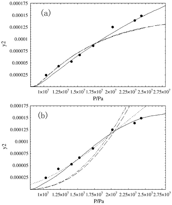 As illustrated in Figure 3, EoS models are utilized to compute the solubility of the drug Chloroquine in SCCO2, with discrete points representing experimental measurements. In both (a) PR-EoS and (b) SRK-EoS models, the discrete points closely align with the curves, confirming the high accuracy of various EoS models. The correlation indicators R2 for both models exceed 0.9, indicating that these models can explain over 90% of the variability. Hence, the dissolution of chloroquine in SCCO2 can be predicted using these models. Therefore, the optimal EoS model may vary for different drugs and requires specific analysis. The Peng–Robinson (PR) equation remains the most widely utilized EoS model for addressing supercritical issues [20,49,50,51].