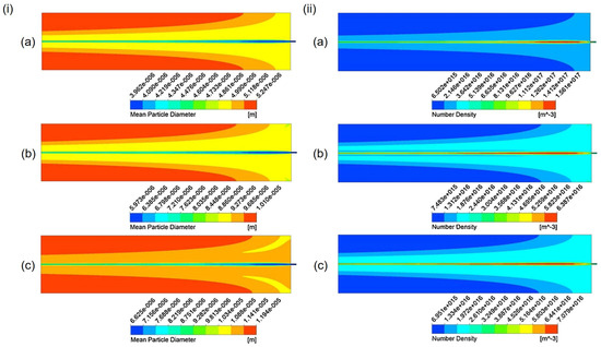 CFD can also simulate particle trajectories in supercritical particle formation experiments, employing specific models such as the Discrete Element Method (DEM) and multiphase flow models (Euler–Euler and Euler–Lagrange). DEM focuses on interactions between particles and is suitable for situations with higher particle concentrations [88]. Multiphase flow models, on the other hand, address interactions between fluids and particles and are well-suited for scenarios with lower particle concentrations [89]. Within multiphase flow models, the Population Balance Model (PBM) has been employed to simulate supercritical particle formation technology. As depicted in Figure 7, Cardoso et al. utilized a CFD single-way coupled particle population balance Equation (PBE, 23) to describe particle distribution during the SAS process for particle production. This approach revealed the relationship between initial flow rates, particle size distribution, and particle density. At the nozzle outlet, where the organic solvent and SCCO2 initially mix due to high flow velocities, particle density is high and particle size is small [90]. Given that in supercritical particle formation, drug particles are relatively scarce compared to SCCO2, the impact of particle motion on the SCF can be disregarded. SCF phase information, on the other hand, provides positional data for the particles. Therefore, using a CFD single-way coupled PBE offers the advantage of reducing computational demands while maintaining precision.