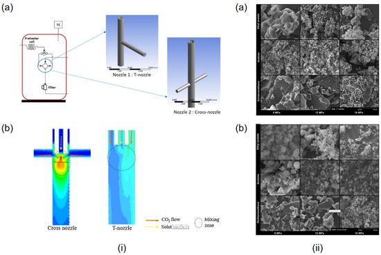 (i) Different shapes of nozzles: (a) Geometries of T-mixer and cross-mixer nozzles. (b) Contour of turbulence intensity in mixing zone of cross nozzle and T-nozzle. (ii) SEM images of Curcuma mangga micronized particles under various operating conditions using (a) T-nozzle and (b) cross nozzle. Copied with permission [92]. Copyright 2020, Elsevier B.V.