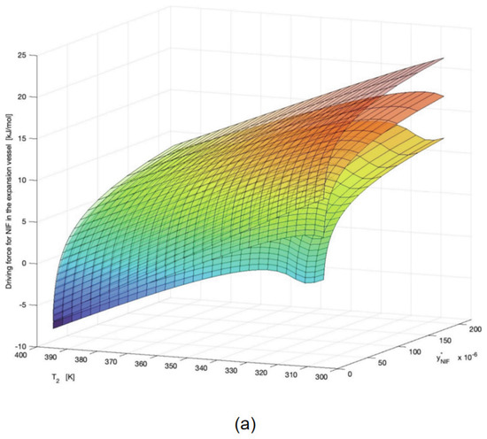 The preparation of nanoparticles using SCF technology presents numerous challenges [101]. Modeling plays a crucial role in facilitating the reduction in drug particle size in SCF technology. Massias et al. leveraged the Chrastil model and PR-EoS to predict the solubility of Nifedipine (NIF) within SCCO2 [102]. This predictive approach was complemented by the calculation of saturation, supersaturation, and driving forces, all aimed at optimizing the process of reducing NIF particle size through the Rapid Expansion of Supercritical Solutions (RESS) technique. At a constant temperature of 353.15K, the computed driving forces under pressures of 15, 24, and 30 MPa were 3010.9, 4443.9, and 5528.1 KJ mol−1, respectively. Correspondingly, experimental particle sizes yielded values of 38, 25, and 9 µm (Figure 9b). It was observed that higher pressures resulted in larger driving forces (Figure 9a), signifying a faster nucleation rate compared to crystal growth, and consequently, the generation of smaller particles. In contrast, the influence of temperature on both driving force and particle size was relatively modest when compared to pressure (Figure 9b). Additionally, temperature primarily impacted solubility, with the solubility decreasing as the temperature increased below the crossover pressure of 20.6 MPa at 15 MPa, leading to an increase in particle size. Conversely, at pressures exceeding the crossover point (24 MPa and 30 MPa), an increase in temperature led to higher solubility and smaller particle sizes.
