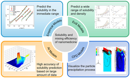 In this review, mathematical models refer to models constructed based on mathematical methods and theoretical foundations to describe and explain phenomena through the formulation of mathematical equations. These models utilize equation-solving techniques to predict outcomes under various experimental conditions. Supercritical nanoparticle formation techniques commonly employ empirical models, semi-empirical models, and EoS to forecast drug solubility in SCCO2. Empirical and semi-empirical models can fit a range of solubility values under different operating conditions by using a discrete set of experimental data. The EoS, grounded in thermodynamic principles, is a physically derived model describing the relationship between pressure, temperature, and density. Consequently, based on its theoretical underpinnings, it can effectively predict solubility beyond the range of experimental data. Furthermore, molecular dynamics models can be employed to ascertain the transport properties of nanoparticles produced through supercritical methods, providing insights into mixing efficiency during the supercritical particle formation process.