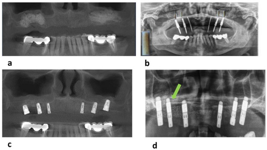 (a) Cone beam CT (CBCT) acquired postoperatively in a patient, in whom Si-CAP granules were used for SFA; (b) panoramic radiographs taken at preparation of the implant bed 6 months after utilizing Si-CAP granules for sinus floor grafting; (c) CBCT acquired subsequent to implant surgery 6 months after bilateral sinus floor grafting using Si-CAP; (d) CBCT acquired after implant placement 6 months after SFA with β-TCP granules: residual bone grafting material is clearly visible (green arrow).
