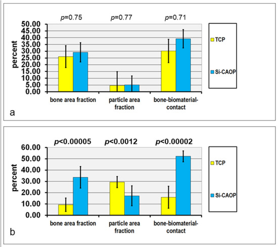Histograms depicting the results of the histomorphometric analysis: bone area fraction, bioceramic granule area fraction, and bone-bioceramic contact of (a) the central ROI and (b) the apical ROI in hard tissue sections of either Si-CAP biopsy specimens or β-TCP biopsy samples, which were harvested six months after sinus floor grafting. All values are the mean + standard deviation of 19 measurements.