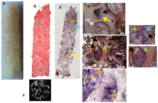 Biopsy sampled 6 months after implanting Si-CAP for sinus floor grafting: (a) macroscopic photograph; (b,c) synchrotron microtomographical image (bone—red; residual grafting materials—grey); (d–h) histomicrographs of undecalcified hard tissue section with immunodetection of OCN (osteocalcin). Excellent trabecular bone formation is visible after sinus floor grafting. A few highly leached and degraded fragments of the Si-CAP granules are embedded in these newly formed trabeculae. Extensive bone ingrowth into the pores of these residues, which feature excellent bone bonding, is present (d,e) (yellow arrows); OS—osteoid. At the degrading Si-CAP granule surface, active matrix mineralization and osseous tissue formation with strong OCN expression are visible in the apical region of the biopsies in close proximity to the bordering sinus mucosa (d–g) (green arrows). As such, progressing bone formation is in tandem with the continuously progressing degradation of the residual Si-CAP granules, which are gradually replaced by the new bone tissue ((e–g) black arrows; (d,h) blue arrows); (i) histomicrograph of 5 µm undecalcified section immunohistochemically stained for von Willebrand factor: visualization of capillary formation (orange arrows) in bone tissue formed in the pores of a degrading Si-CAP granule six months after sinus floor grafting (bar = 20 µm).