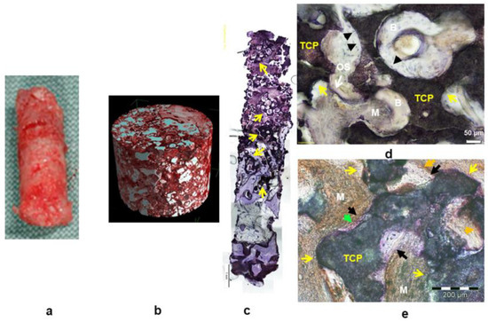 Biopsy harvested 6 months after SFA with β-TCP: (a) macroscopic photograph; (b) synchrotron microtomographical image (bone—red; residual grafting material—white); (c–e) histomicrographs of undecalcified hard tissue sections with immunodetection of collagen I (d); osteocalcin (e). A greater amount of residual β-TCP bone substitute material is visible (c–e) (yellow arrows) in comparison to Si-CAP biopsy samples. The β-TCP granules display excellent bone-bioceramic contact in the central ROI (d) (black arrowheads) with bone ingrowth into the pores of the β-TCP granules. OS—osteoid; B—mineralized bone tissue; M—osteogenic mesenchyme. (e) Histomicrograph with β-TCP bone grafting material in the apical ROI. Commencing bone formation (black arrows) at the bioceramic surface (yellow arrows) and osteoblasts with strong staining for OCN (green arrowhead) are present in combination with moderate OCN staining of the osteogenic mesenchyme indicating active matrix mineralization (orange arrows).