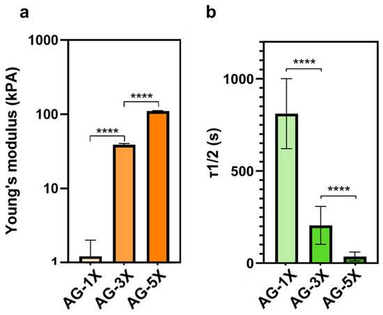 Viscoelastic properties of AG-nX (n = 1, 3, 5) hydrogels at 37 °C. (a) Young’s modulus of AG-nX (n = 1, 3, 5) at 37 °C. One-way Anova with Tukey’s multiple comparison test. (b) Mid-stress relaxation time at 37 °C. Results presented as mean ± SD. ****: p < 0.0001 (at least n = 3 per condition).