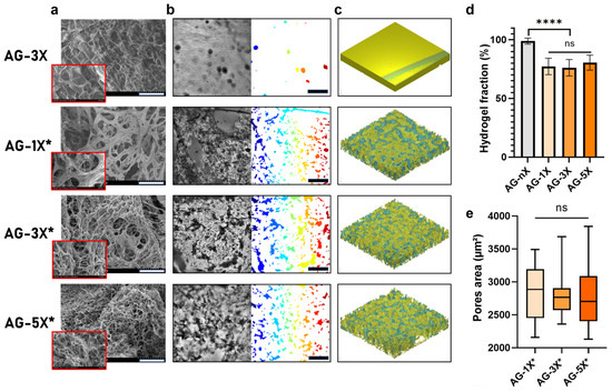 The difference in the hydrogels’ concentration was also evident in the microstructure of the porous hydrogels created using the liquid–liquid emulsion method. As depicted in Figure 2a, the microporosity of the hydrogels exhibited a significant diameter in the porous AG-1X formulation, while it was reduced in the porous AG-3X formulation and reached a minimum in the porous AG-5X formulation. It is important to note that this observation was based on dehydrated and, consequently, denatured samples. Nonetheless, the presence of PEG had a discernible effect on the structure of the hydrogels, as evidenced by the comparison between AG-3X (dense) and AG-3X* (porous) formulations, which revealed the presence of open and interconnected pores.