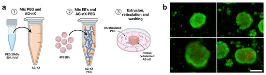 Spheroid inclusion process in hydrogels and post-inclusion viability analysis. (a) Preparation of porous hydrogel, inclusion of AG08C5 spheroids, deposition of 50 µL of sample and cross-linking of AG-nX (n = 1, 3, 5) a 37 °C. (b) Viability of spheroids post-inclusions (live-dead assay). Scale bar = 200 µm.