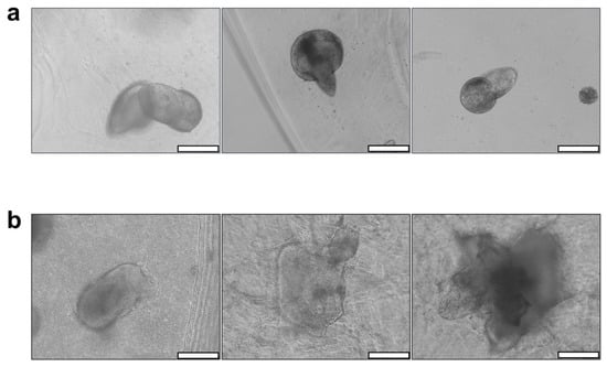 Impact of AG-nX (n = 1, 3, 5) hydrogel porosity on AG08C5 hiPSCs spheroid growth at D7. (a) Phenotype of AG08C5 spheroids included in dense AG-nX hydrogels. (b) Phenotype of AG08C5 spheroids included in porous hydrogels AG-NX. scale bar = 100 µm.
