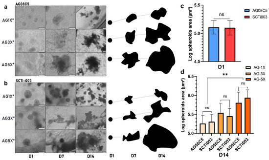 A comparison of the area occupied by spheroids before inclusion and after 14 days of maturation in gel one reveals a growth phenomenon. After maturation, the surface area occupied appears to be directly related to the AG-nX* (n = 1, 3, 5) formulation used, as shown in Figure 5a,b, regardless of the cell line studied.