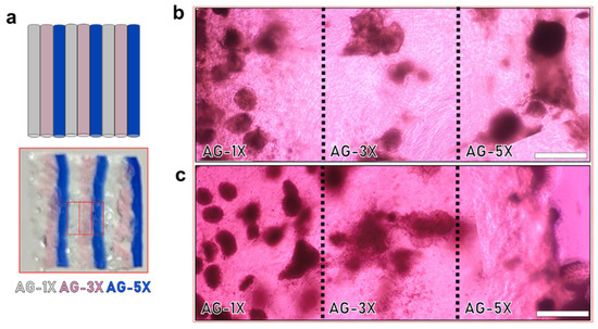 Impact of viscoelastic properties of AG-nX hydrogels (n = 1, 3, 5) on the growth of hiPSCs spheroids in transversal culture at D14. (a) Representation of alternating hydrogels in transverse culture (AG-1X, AG-3X and AG-5X, extruded 3 times). (b) AG08C5 spheroids deposited in the same well at D14. (c) SCTi-003 spheroids deposited in the same well at D14. Scale bar = 500 µm.
