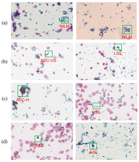 Examples of cells, where (a) are negative for intraepithelial lesion or malignancy (NILM) cells; (b) are atypical squamous cells of undetermined significance (ASC-US) and low squamous intraepithelial lesion (LSIL) cells; (c) are atypical squamous cell/cannot exclude HSIL (ASC-H) and high squamous intraepithelial lesion (HSIL) cells; and (d) are squamous cell carcinoma (SCC) and adenocarcinoma (AdC) cells.