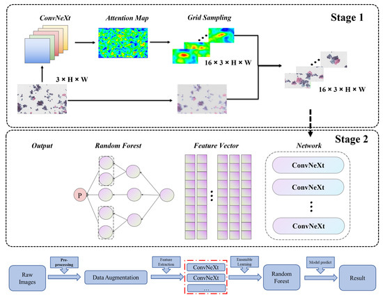 The overall process is shown in Figure 6, which was divided into stage 1 and stage 2. In stage 1, we introduced a self-supervised learning method to enhance the data. We use the attention map to determine the possible diseased cells and then segment the image based on the determination results to expand the dataset to 16 times the original, laying the foundation for the construction of the subsequent high-precision classification model. In stage 2, considering the complexity of cell classification tasks and the small differences between different types of cells, the model was very mixed. Here, we introduced an ensemble learning strategy and used a random forest strategy to optimize the final classification results.