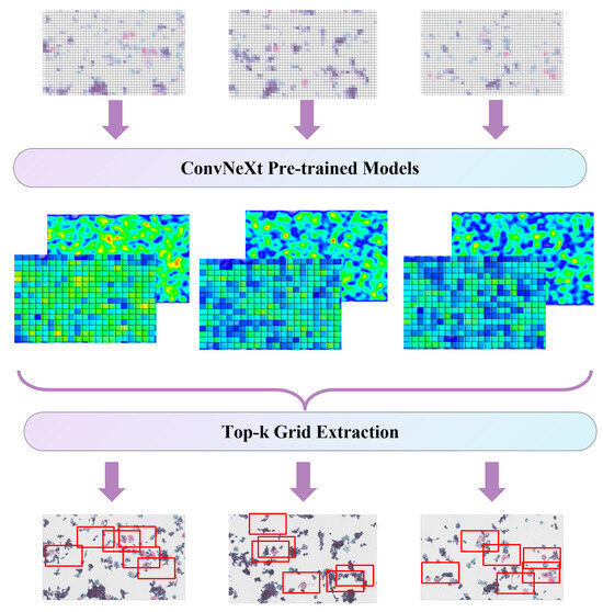 A larger dataset means a more accurate classification model. To expand the dataset, we proposed a novel data enhancement method based on a self-monitoring method using an attention map. This method could visualize the attention of ConvNeXt, and data augmentation based on this method made the trained ConvNeXt model pay better attention to the lesion areas in the whole image. We first trained a preliminary classification model based on the original dataset, and then we extracted an attention map of the classification model and decomposed it into grids. The specific process is shown in Figure 7.
