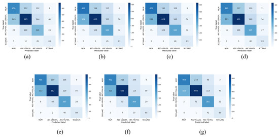 Comparisonof the test set classification accuracy under different optimization strategies: (a) Raw ConvNeXt; (b) +CutMix; (c) +Autoaug; (d) +Randaug; (e) +SDA; (f) +ELS; (g) Our Method.