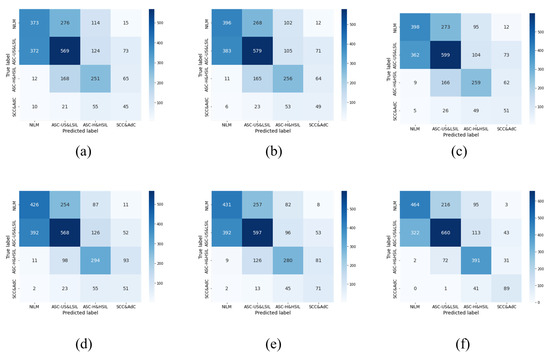 Comparison of the classification accuracy of the test sets using different advanced methods: (a) ResNet [35]; (b) Inception [32]; (c) DenseNet [36]; (d) Swin [67]; (e) Beit [68]; (f) Our Method.
