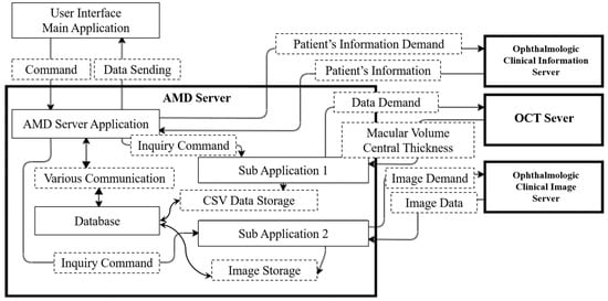 Figure 1 shows the system configuration diagram. The AMD VIEWER system consists of a user interface main application (Main App) on a client PC and four servers connected by a hospital local area network (LAN). The servers comprise an AMD server, an ophthalmology information server, an OCT server, and an ophthalmology image server. Triggered by input instructions from the Main App, two original collaborative applications placed on the AMD server automatically retrieve necessary information from the other three servers and display it on the interface monitor. All collected data are stored in the AMD server’s internal database. From the subsequent access, a combination of stored and newly acquired data is displayed on the monitor (technical details regarding the server cannot be provided for security reasons).