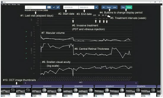 From the perspective of avoiding dropouts, it is essential to measure macular volume and central retinal thickness, which correlate with the activity of AMD, and to provide continuity of explanation to patients [,]. Nevertheless, no EMR tool can compile a list of treatment event dates and visual and anatomical information, which is particularly important for supporting the acquisition and understanding of AMD-specific information. The importance of such an EMR tool for the long-term management of AMD is heightened due to the significant impact that information on treatment intervention dates can have on physician decision making.