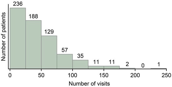 Of the database’s 977 AMD patients, we included 670 (68.6%) patients with PDT or vitreous injection therapy medical histories. The mean (SD) age of the subjects was 78.1 (9.2) years, and 492 (73.4%) were male. The mean (SD) interval from the earliest to the latest visit was 1934 (1457) (range 0–6557) days, and the mean number of visits was 45.7 (35.5) (range 2–225). Figure 4 shows the frequency distribution table. The mean number of vitreous injections was 10.3 (12.6). A total of 315 patients dropped out (dropout rate = 47.5%), 347 remained active, and 8 experienced other events (4 deaths and 4 referrals). The mean number of hospital visits for the dropout and functional groups was 42.9 (35.4) and 48.4 (35.7), respectively, significantly less in the dropout group (p = 0.0491 by Tukey’s HSD test). The number of injections was significantly lower in the dropout group (7.9, SD 9.1) than in the active group (12.6, SD 14.8) (p < 0.0001 by Tukey’s HSD test). Furthermore, the minimum corrected logMAR visual acuity value (maximum corrected Snellen visual acuity) during the observation period was 0.890 (±0.762) in the active group and 1.110 (±0.782) in the dropout group, with the active group showing significantly better results (p < 0.0001, Steel–Dwass test).