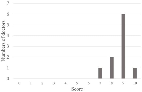 Of the ten ophthalmologists, none rated the recommendation score below 6, one rated it as 7, two rated it as 8, six rated it as 9, and one scored 10. As a result, in the classification for calculating the Net Promoter Score (NPS), 70% were Promoters, and 0% were Detractors, resulting in an NPS of 70% (Figure 6).