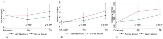 - Ramlawi, B.; Rudolph, J.L.; Mieno, S.; Khabbaz, K.; Sodha, N.R.; Boodhwani, M.; Levkoff, S.E.; Marcantonio, E.R.; Sellke, F.W. Serologic markers of brain injury and cognitive function after cardiopulmonary bypass. Ann. Surg. 2006, 244, 593–601. [Google Scholar] [CrossRef] [PubMed]