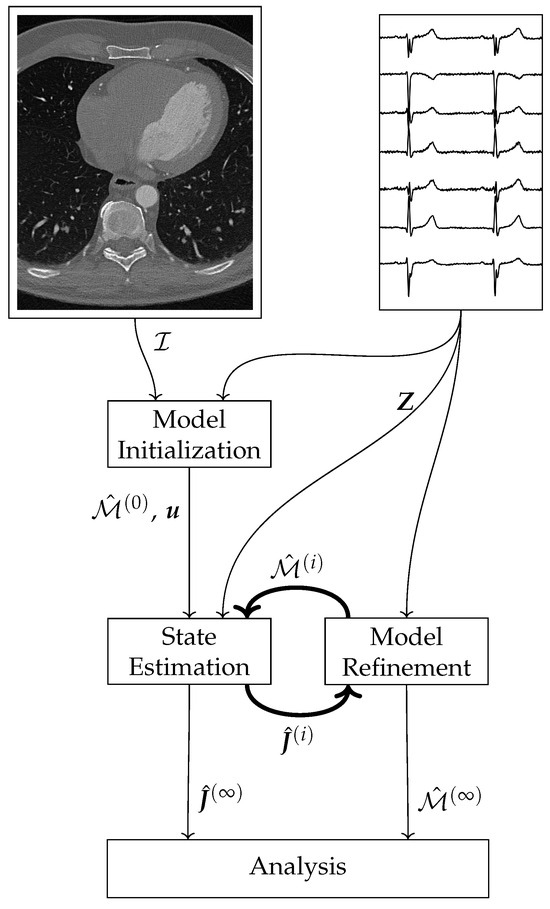 The Model Initialization uses image data , and knowledge of the electrophysiology of a healthy heart to construct the initial state space model . In the State Estimation part, a sparse Kalman filter estimates the current densities from the model and the measurements , where the superscript i indicates the epoch. Using the estimated current densities and the measurements , the new model is calculated in the Model Refinement block. The main loop consists of the steps State Estimation and Model Refinement. These two steps execute alternately. After termination, the final estimated current densities and the final model can be used for further analysis.