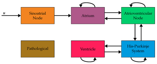 We consider six voxel types in this study: sinoatrial node, atrium, atrioventricular node, His-Purkinje system, ventricle, and pathological. These six types are the minimum number needed to model the electrophysiology of the heart sensibly. They allow for a localized excitation of the heart, a localized connection between the atria and ventricles, a coordinated excitation of the ventricles via the His-Purkinje system, and a disturbed function via the pathological voxels. The assumed connectivities between the voxel types [15,18,22,23] are shown in Figure 2.
