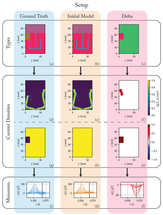 We use a array of ideal magnetic sensors. The sensors are placed equally across a region centered 200 mm above the heart. Since we simulate one layer of voxels, the measurements have to be scaled up to match reasonable field amplitudes as reported in [29,30,31]. We scale the measurements by a fixed factor of 70 to achieve a maximum R-peak amplitude of 100 pT for the ground truth model. We then superimpose the simulated signals with white noise of an equivalent noise spectral density of 40 fT/, which is in the order of low temperature superconducting quantum interference devices (SQUIDs) [8]. Figure 3j–l depict the magnetic measurements around the time of the QRS-complex. The dashed black line indicates the time of the maximum difference (22.5 pT) between the ground truth and the initial model at time .