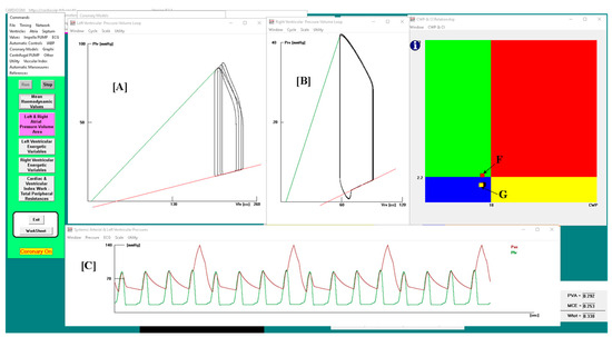 Panel (A,B) shows the left (right) ventricular pressure-volume loops. Plv≡LVP; Vlv≡LVV (left ventricular volume); Prv≡RVP; Vrv≡RVV (right ventricular volume); Pas≡AoP. Sixteen aortic and left ventricular pressure waveforms are plotted in panel (C). In this case, the IABP was driven in 1:4 mode and drug administration was simulated by reducing the pulmonary vascular resistances by 10%. On CI–CWP graph, the rectangle point moves from G position (IABP off) to F position (IABP on).