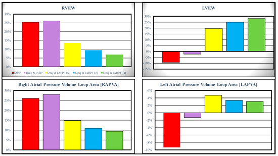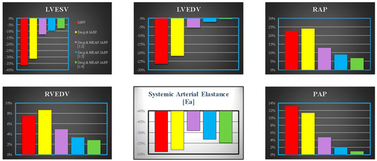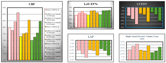 In contrast, different effects were observed on the left ventricular ejection fraction (the white bar and the bar with the vertical red line in the top-middle panel), where the simultaneous application of the IABP and Impella 2.5 generated higher percentage variations compared to the application of the IABP (driven in full and partial modes) and the drug administration (Figure 8). The top-right panel (bottom-middle panel) shows that the combination of the IABP (driven in partial mode) and the LVAD (with a rotational speed of 50,000 rpm) induced a reduction of between 25.6% and 19.88% (25.95% and 22.84%) in the left ventricular end-diastolic volume (left atrial pressure). Finally, the same combination of devices (driven in the same conditions) produced an increase of between 26.2% and 21.35% in the right atrial pressure-volume loop area (bottom-right panel in Figure 8).