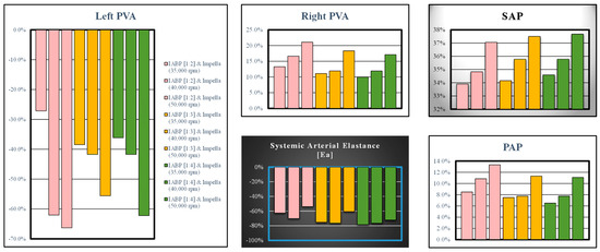 The combined action of the two devices produced opposite effects on the left ventricular pressure-volume area (left panel in Figure 9) and the right PVA (top-middle panel). In both cases, the highest percentage variations occurred when the LVAD was set to 50,000 rpm. The effects induced on the systemic arterial pressure and systemic arterial elastance were opposite to each other, but in both cases, they were higher when the IABP was activated in the 1:2 mode (top-right and bottom-middle panels in Figure 9, respectively).